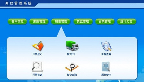 3、销售管理:开票登记、开票查询、提货出厂、提货查询、未提查询、原料使用;