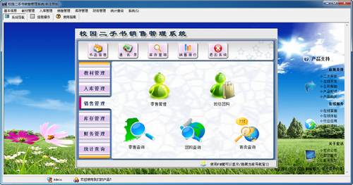 销售管理:零售管理、班级团购、零售查询、团购查询、寄卖查询。