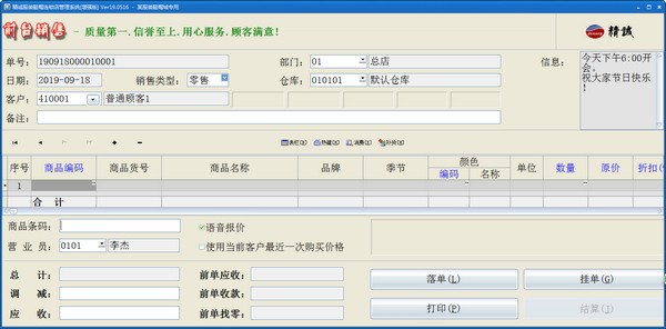 支持POS销售。可以根据需要选配打印机、读卡器、会员卡、条码枪、钱箱、顾客显示屏及小票打印机;可以根据自已喜好设计各种有特性的打印格式。快捷键丰富多样,可以自己定义,完全可以用键盘取代鼠标的操作。销售时可以适时掌握每一个商品的当前库存数,销售成本、销售毛利,可以随时盘点;