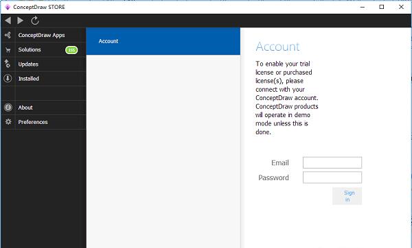 STORE。点击窗口左下角的“连接到账户”,进入“账户”选项卡。当账户标签出现输入您的电子邮件和密码,然后点击确定,也可以点击链接“登录ConceptDraw.com”。如果您没有在conceptdraw.com上登录您的帐户,您可能需要输入电子邮件和密码才能访问。