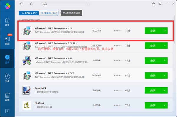 如果提示要安装.net2.0,用电脑管家之类的软件装一下,如图