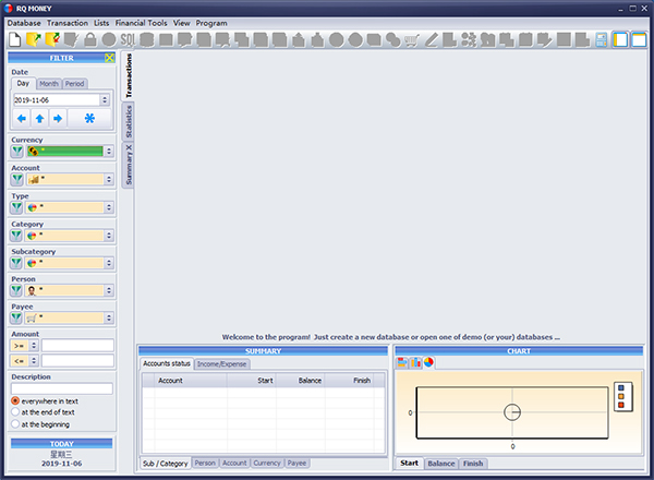 Money绿色版创建新数据库时,需要设置其名称、位置、货币和密码。后者的选项必须配置一个帐户名称,开头余额,货币,票据和日期的基础。此外,还可以向列表中添加类别和子类别(贷方或借方)。可以通过指定日期、金额、类型、说明、包含帐户、类别、人员和收款人来创建新交易此外,您还可以拆分、复制和导出事务(以PDF或XLS格式),以批处理模式编辑其属性,创建计划并查看计划日历,编写付款,生成每月预算和签出统计数据等。