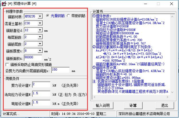 钢结构预埋件计算工具绿色版用户通过输入锚筋材质、混凝土基材、锚筋直径、每层筋数、锚板层数、锚板面积等基本参数即快速实现对预埋件的计算。