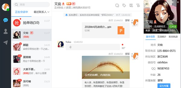 多公众号对接,多客服协作,和微信聊天一样与粉丝沟通,唤醒沉默粉丝,激活潜在客户,支持PC客户端和手机端,打破48小时限制随时沟通,抢单派单模式任选不错过任何商机。