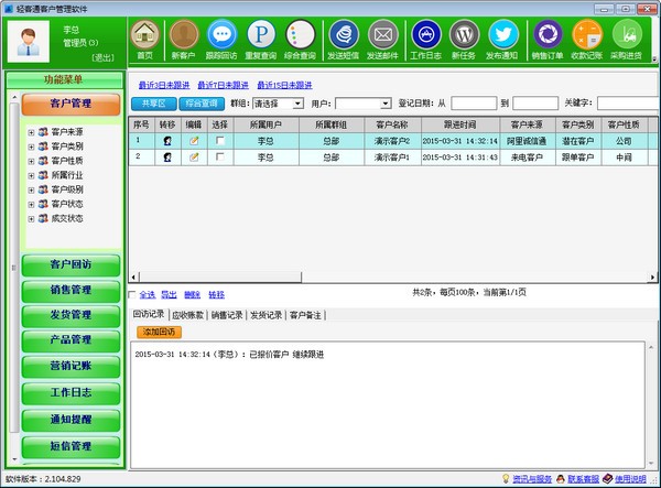 锁定销售目标,管理销售时间,利用电话营销、短信营销、邮件营销等工具和及时有效的客户回访提醒、生日提醒、到期提醒等为跟进回访客户,建立友好的客户关系,提供了便捷平台。