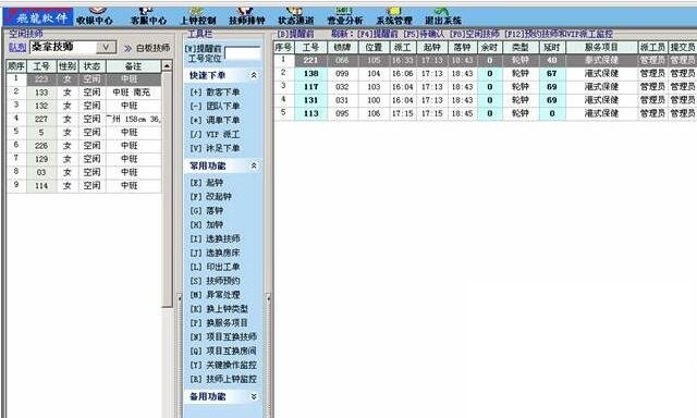 技师预约:对技师进行场内预约、场外预约、CALL钟预约操作,对预约技师进行派工操作等