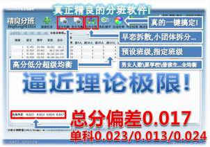 精良智能自动分班系统免费版|新生编班|偏差0.01~0.05(请注意小数点后有个0,敬请验证!)。顶尖级别指标,逼近理论极限(用户评语),关系生打招呼预设班级,早恋小团体互斥分散,尖子生、差生、高分、低分、男女