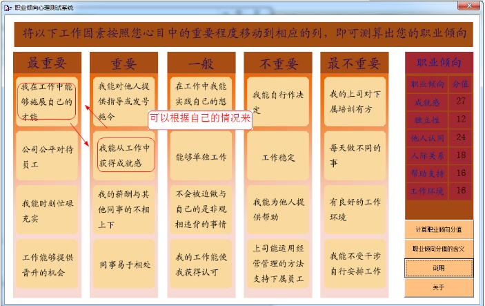 职业倾向心理测试软件官方版是一款非常优秀且出色的职业倾向测评软件,职业倾向心理测试软件官方版主要用于测试一个人适合从事哪一方面的工作,里面设置了5个选项,分别是最重要的、重要的、一般的、不重要的、最不重要的。把相应的内容放在这几个选项内,就内大致推出你的职业倾向,方便又实用!