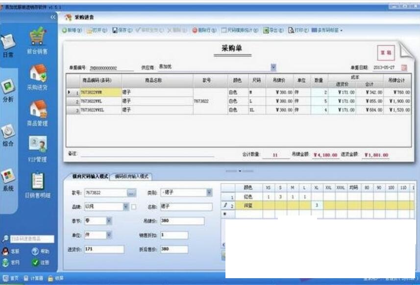 易加优服装销售管理软件中文版是一款专门适用于服装进销存销售管理工具,易加优服装销售管理软件中文版可以支持条码扫描枪、小票打印机、条码标签打印机等等,采用先进的轻型的数据库SQLite,主要适用于服装店、内衣店、鞋店、皮具箱包、床上用品、母婴用品等等店面,可以满足用户的各种需要。