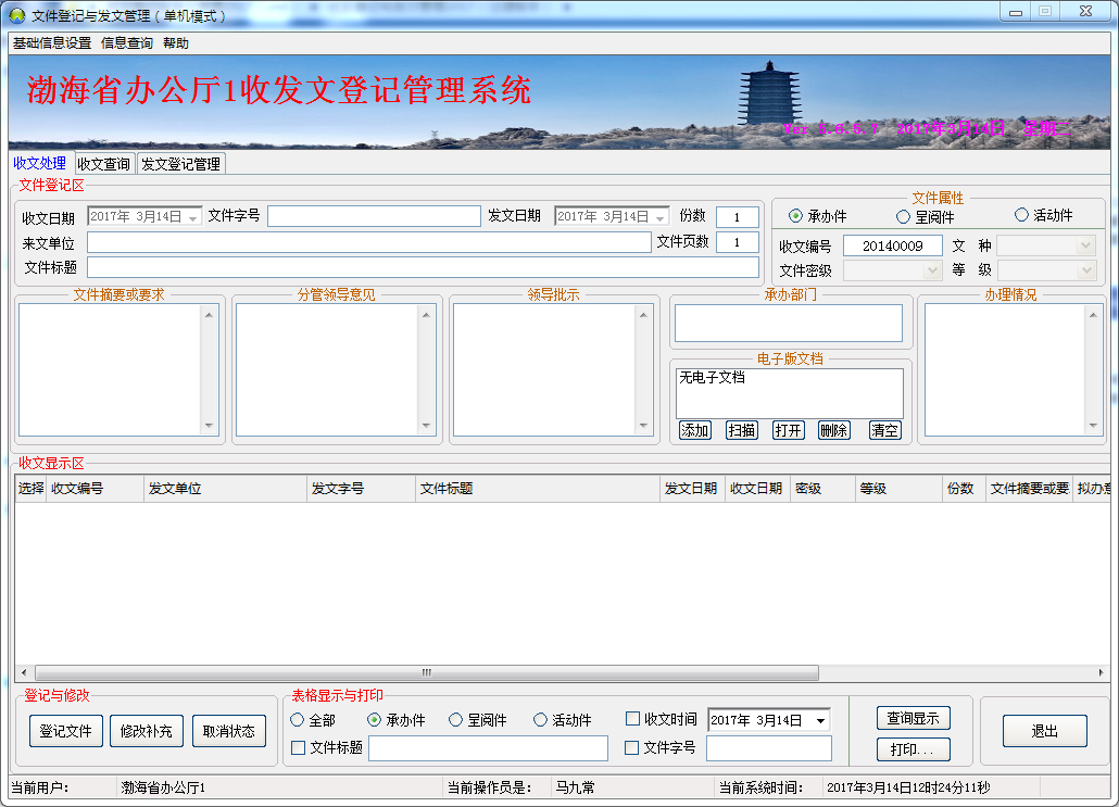 (1)随时登记单位所收到的文件,打印收文处理单,支持批量打印功能。