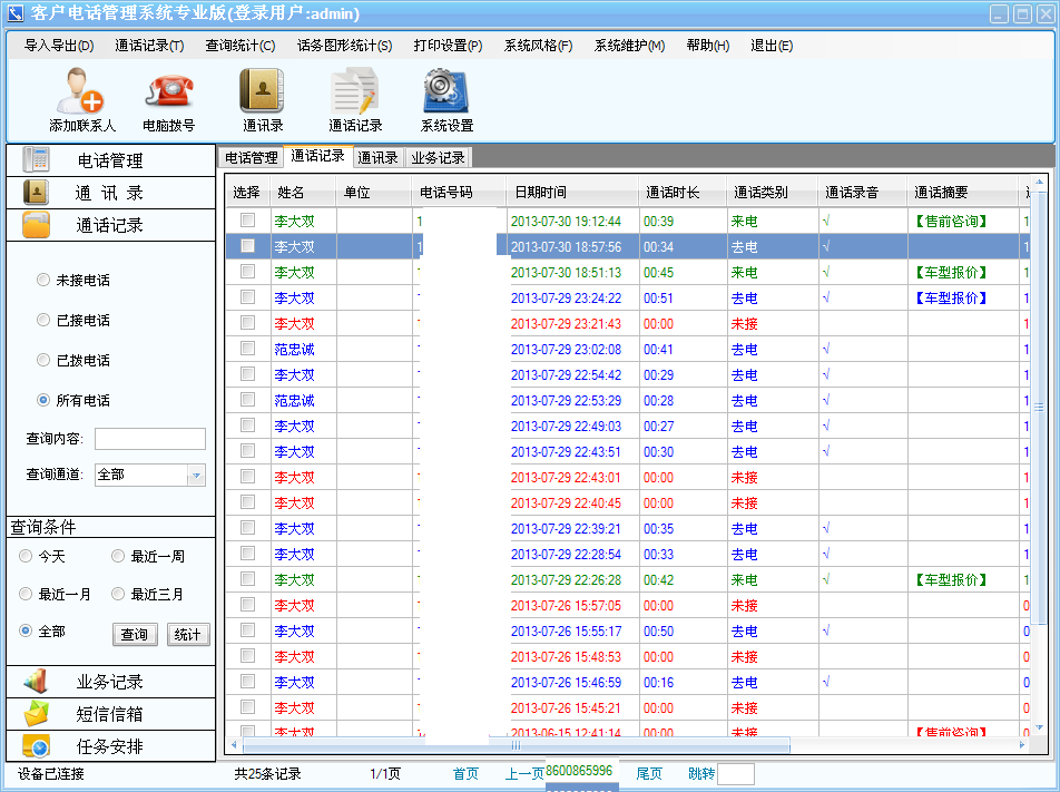 通话录音记录查询:根据通话时间、通话类型、通话号码、联系人姓名等属性进行灵活的通话录音记录查询,查询结果可以导出至Excel文件。