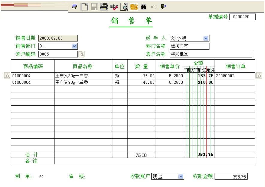 16、销售单:商品销售给客户,录入相关的出货信息,包括客户,商品编码,数量,单价等。