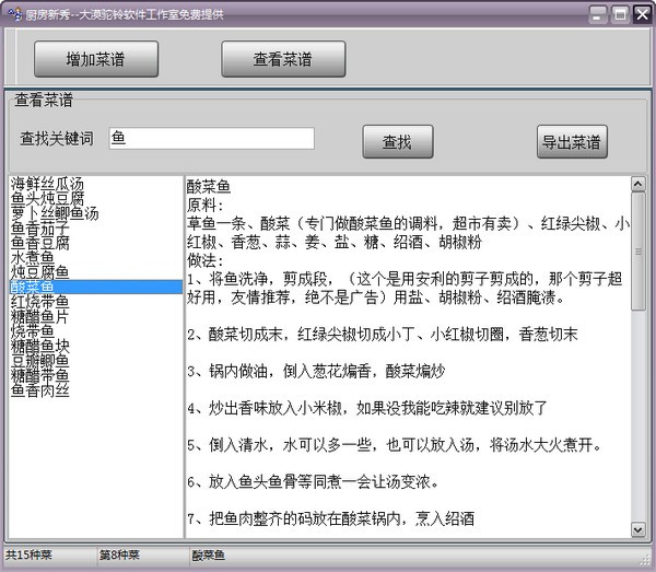 厨房新秀电脑版是一款非常受欢迎的餐饮行业服务软件,厨房新秀电脑版主要为用户提供130种菜谱,同时支持用户自己添加菜谱,还能够导出菜谱,快速搜索需要的菜谱等功能,在一定程度上,满足用户的需要。