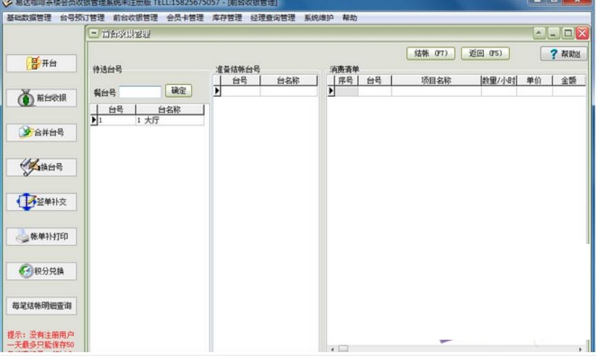 适用于茶楼、咖啡厅收费管理,完全模拟了咖啡厅的营业功能,具有开台,添加消费,结帐收银,快速查询台号,批量开台,包厢计时收费等功能。支持会员积分查询、商品维护管理、库存管理(进货/退货、入库/出库、库存盘点、库存账务明细)。