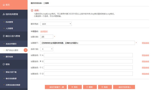 除配套的标准图纸和题目外,还支持教师从本地导入图纸和题目,不断更新,建设自己的教学资源库。