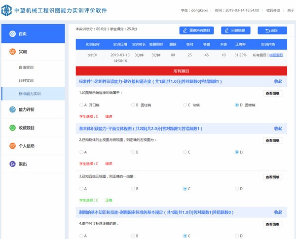 “中望机械工程识图能力实训评价软件”重点解决了学生自学的需求,提供了自由、计时、标准能力三种实训模式,学生可以根据自己的需要,选择适合自己的自学模式,反复强化训练,循序渐进提高识图能力。