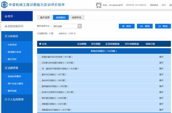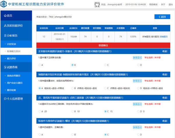“中望机械工程识图能力实训评价软件”大大改善了教师的组卷体验,教师可自由浏览所有题目,可在日常教学过程中发起测试、进行实训、或进行能力评价使用;通过软件强大的智能组卷功能,两分钟即可发布一场能力测评,自动生成统计数据,并可导出成绩单,用于指导后续针对性的教学。