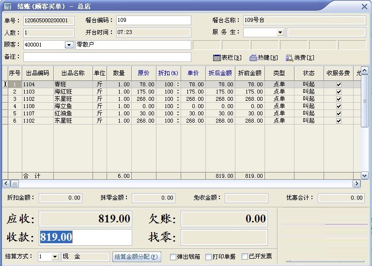 6、计价、结账简单明了,没有繁琐的选项,却有强大的处理功能,包括会员积分、折扣、免收、加收。结账单打印格式可任意设置,非常符合茶楼行业实际需求。