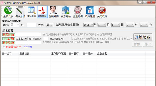 特别说明:软件提供的起名方法非常标准,非常符合常规起名方式、自动利用极佳的文字搭配起名,让你轻松完成公司起名,早日开张营业!
