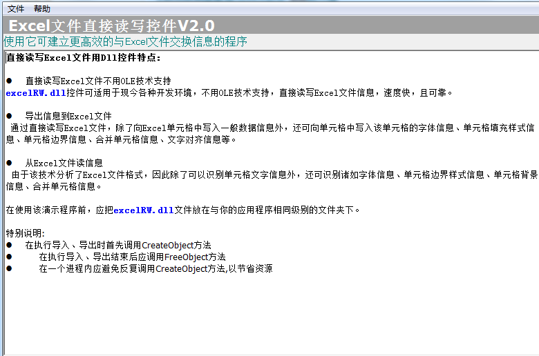 ExcelRW直接读写DLL控件最新版是款很便捷的用于一些excel文件读写控件的辅助工具,ExcelRW直接读写DLL控件最新版可帮助用户直接读写Excel文件,无需OLE技术支持,从而实现各种开发环境,同时支修改写入然后保存及导出Excel,也可适用于现今各种开发环境,如:VB、VC++、DELPHI、PB等,不用OLE技术支持,直接读写Excel文件格式信息,速度快,且可靠。