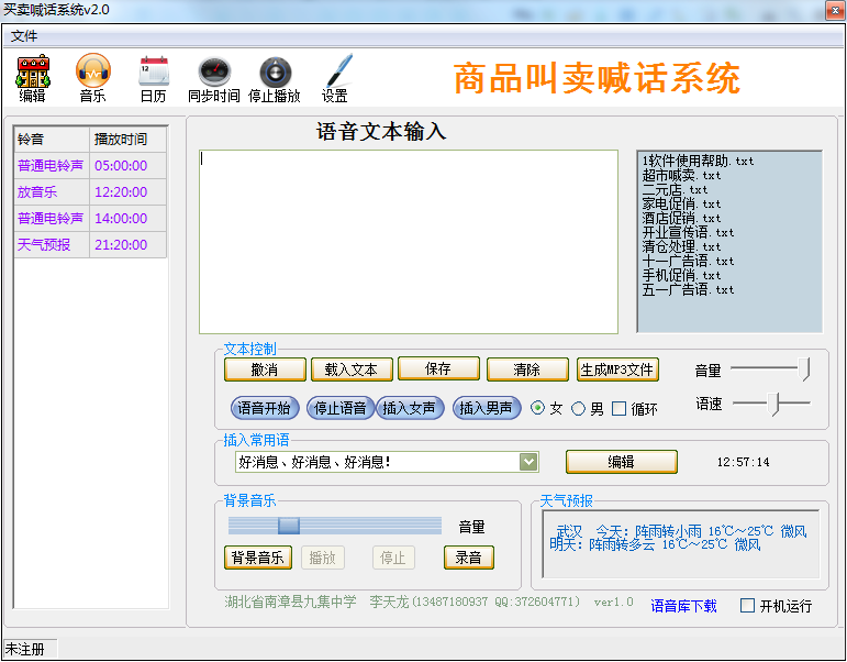 超市售卖喊话系统最新版是款多用于各大商场以及超市中的促销商品喊话系统,超市售卖喊话系统最新版可根据自己的实际情况,将所需要的商品买卖喊话内容编辑到软件中,软件即可更加文字内容自动报读,随时可播放;软件在语音自动喊话方面采用真人发音,播放流畅,还能配背景音乐等。