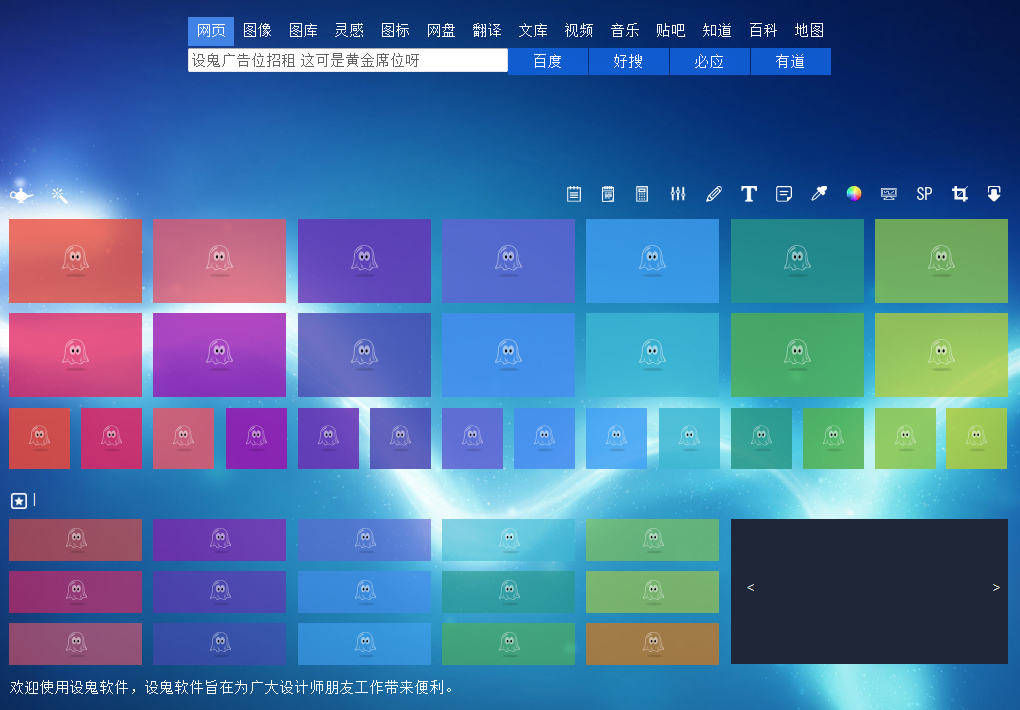 强化设计类的搜索功能:加入了设计师常用的搜索,如图库搜索、图标搜索、灵感搜索、网盘搜索等,并将文库、翻译等常用功能加入,大大方便设计工作人群。