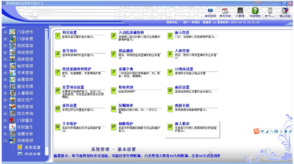 主要功能包含以下模块:门诊一卡通管理、门诊挂号、门诊医生站、门诊收费、住院管理、药房管理、药库管理、住院护士站、手术管理、病案管理、医技管理、人事管理、固定资产、物资管理、综合查询、住院医生站(包含结构化的电子病历)、决策分析、系统管理等模块。根据中国现有中小型医院工作流程,量身定做的。软件结构清晰,图形化向导,采取关键字、拼音码、五笔码、自编码多种快捷码,满足不同的用户的需求,系统具有投资少,见效快 、安装简单,维护容易等特点。