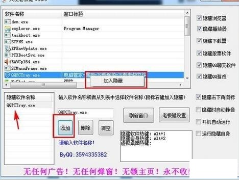 也支持对股票软件、QQ聊天软件隐藏