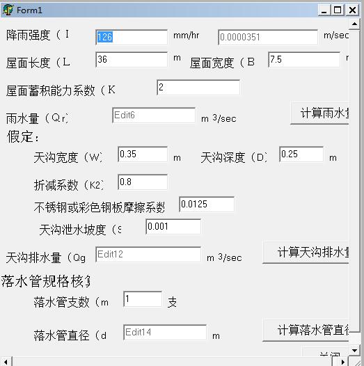 1、已知降雨强度,屋面长度,屋面宽度,屋面蓄水能力系数,计算雨水量;