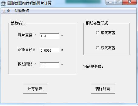 打开软件,输入网片直径、钢筋直径及钢筋间距后选择钢筋布置形式,点击计算结果即可计算出钢筋总长度。