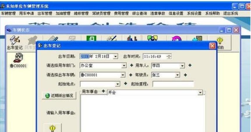 答:1、出车登记:派车时登记用车人、目的地、事由等,登记后车辆状态变为出车状态。