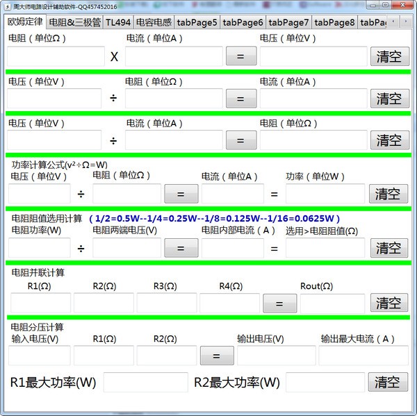 电路设计辅助软件功能:电阻、电流、电压计算;电阻阻值选用计算,电阻并联计算、电阻分压计算;电阻温漂计算,可根据