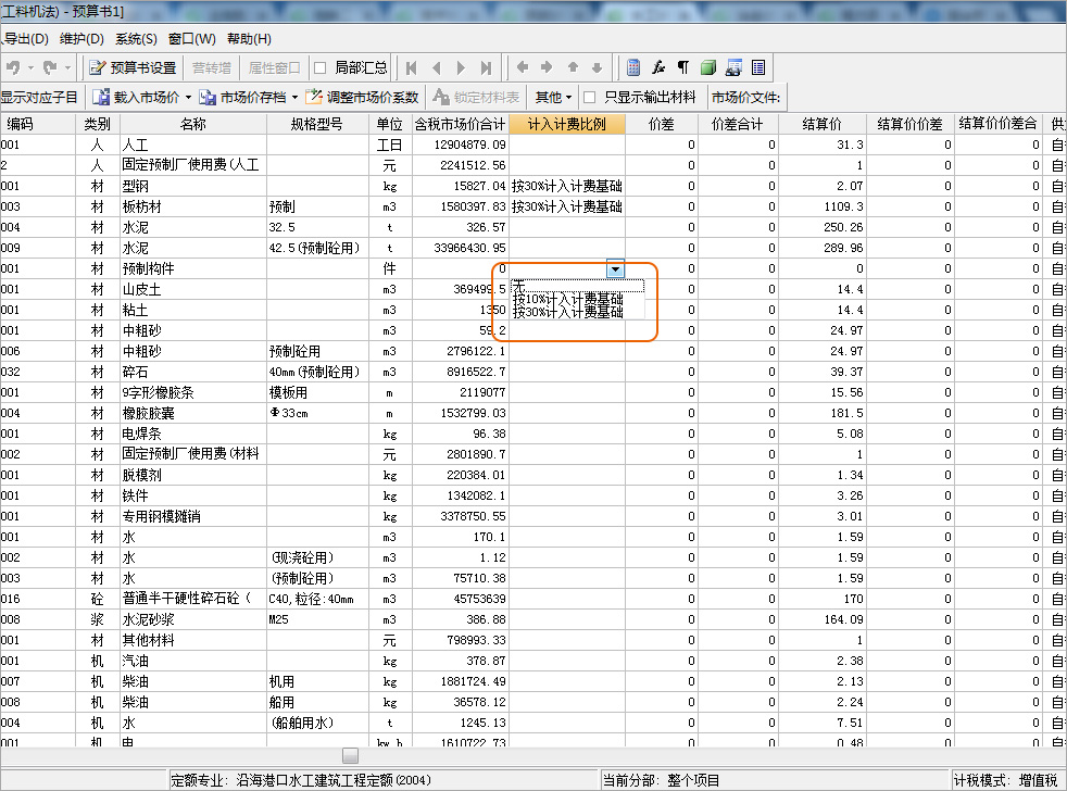 《沿海港口建设工程概算预算编制规定》对水工建筑工程的外购刚桩、大型钢结构等材料的计费做了相应规定。软件人材及汇总界面增加【计入计费比例】列,根据材料选择比例,会直接汇总到取费表,自动扣减不取