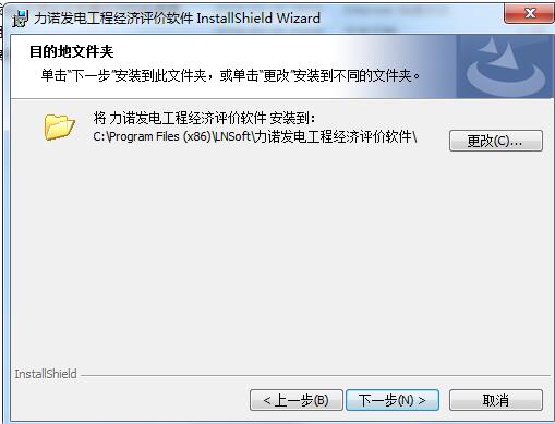 4、选择力诺发电工程经济评价软件目的地文件夹,默认的是C盘,可以点更改修改
