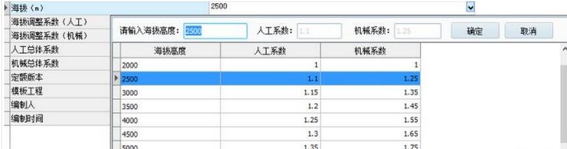 海拔高程选择如下图所示,也可直接在下图的文本框中输入海拔高度。海拔高度会影响人工系数和机械系数。