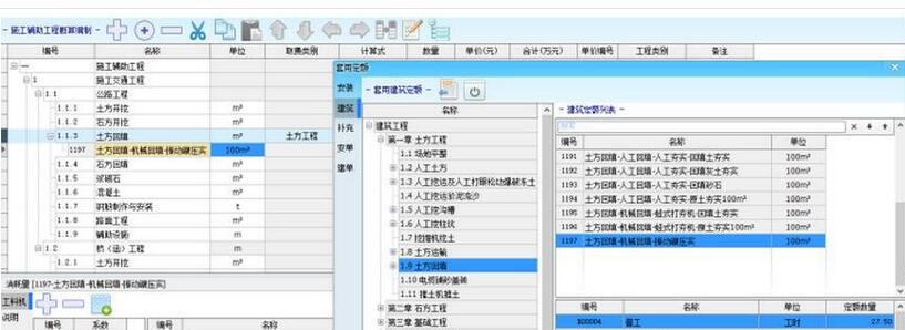施工辅助工程概算、设备及安装工程概算、建筑工程概算、其他费用概算都是按编规中的要求进行项目划分,同时可对概算项节点进行新增、编辑、删除、剪切、复制、粘贴、上/下移、升/降级、新增安装费、新增综合运杂费等,以及对最底层概算项套用定额。也可手动输入数量及单价,以计算出施工辅助、安装、建筑工程概算的合计值。如下图所示:
