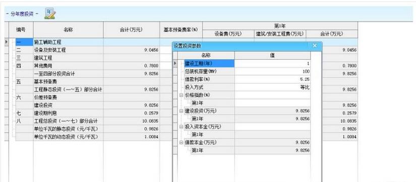 分年度投资和总概算统计出各项工程合计值、根据建设工期、价格指数、借款利率、投入方式、投入资金、基本预备费率等计算出相应的建设期利息、基本预备费、价差预备费、工程静态投资、总投资、单位千挖静态和动态投资,如下图所示: