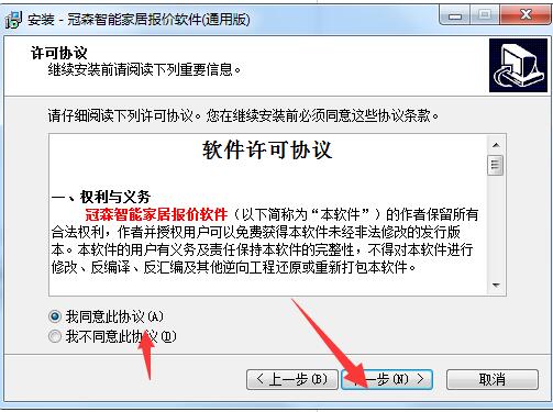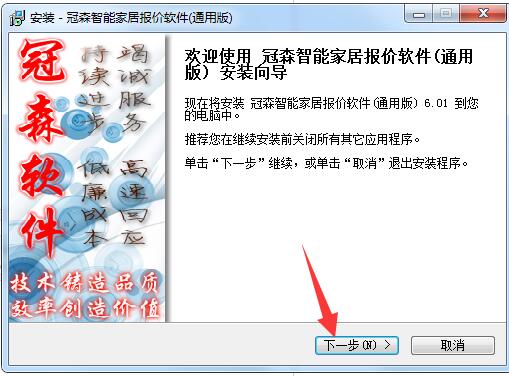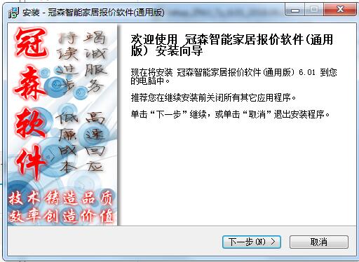 1、双击exe文件,进入欢迎安装冠森智能家居报价软件界面,点击下一步