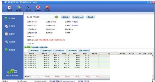 对会员消费情况进行录入,自动完成累计积分,消费打折。也可以增加会员消费商品的详细信息。