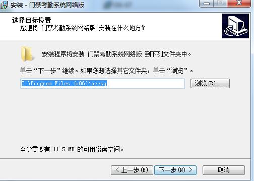 2、选择目标位置,需要将门禁考勤系统网络版安装在什么位置,默认的是“C:\Program Files (x86)\accsq”,想修改点浏览