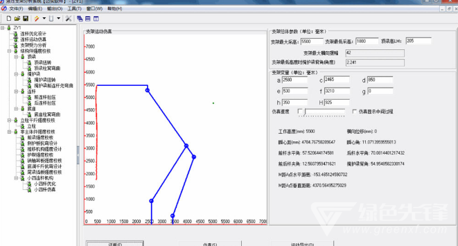 连杆运动仿真模块是根据确定的四连杆参数对液压支架的运动轨迹进行仿真,实时、动态地模拟支架在升降过程中的运动情况,使设计人员对支架的运动过程有一个清晰的认识和了解,确保了设计参数的合理性和准确性,同时提供仿真数据的报表输出。
