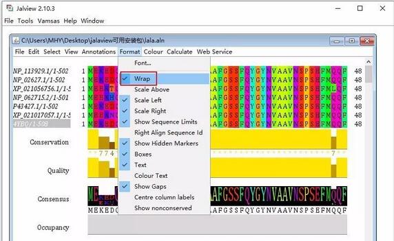 通过在Format 菜单下,点击Wrap ,可使序列窗口中的序列的展示方式由“单段”显示变为“分段”显示,用鼠标拖动序列窗口边缘改变窗口宽度的同时,每行显示的残基数随之改变,如下图。