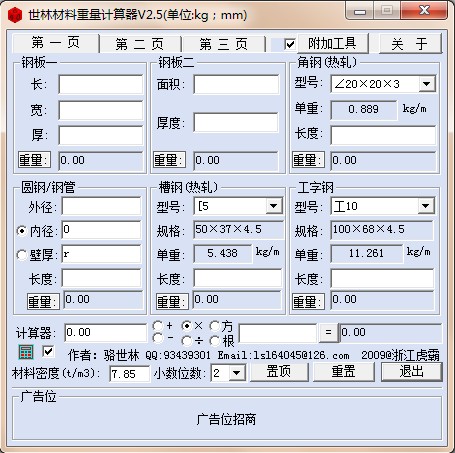 涵盖几乎所有国标型材的重量计算,包括钢板、角钢、工字钢、槽钢、H钢、T钢、钢管、方管、矩形管、圆钢、螺栓、螺母、轴承、垫圈、开口销、钢丝绳、焊管、花纹板、钢板网等,还可以自己定制材料。少许功能需注册,但不碍事,不注册照样可以满足绝大多数的使用要求。一个材料重量计算器,种类较齐全(钢板、角钢、工字钢、槽钢、H钢、T钢、钢管、方管、矩形管、圆钢、螺栓、螺母、垫圈、开口销、钢丝绳、焊管、花纹板、钢板网)外加一个计算器,可计算加、减、乘、除和乘方、开方;