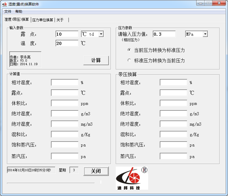 输入一个已知参数,方便计算出多个其它湿度参数。在不同的环境条件下(比如温度和压力不同)