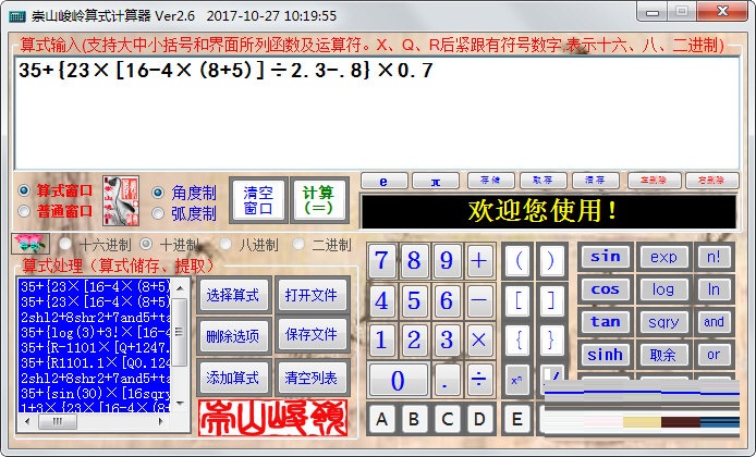 1、算式窗口:可以对算式进行相关编辑、存储、粘贴、修改以及计算,长度可达256个字符,并且可以同时出现各种不同进制,支持各种不同函数及位运算,支持大中小括号,在计算三角函数时,还可以设置角度制以及弧度制。