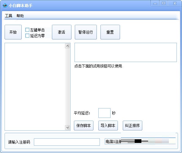 小白脚本助手绿色版是一款功能超级好用的脚本编辑工具,小白脚本助手绿色版内置了十多条命令,用户可以通过这些命令写出自己所需要的辅助脚本,能够支持制作鼠标自动点击器、游戏练级脚本、办公脚本等多种脚本,而且其操作十分的简单,用户甚至不需要学习任何编程语言,您仅需稍加摸索即可运用自如。