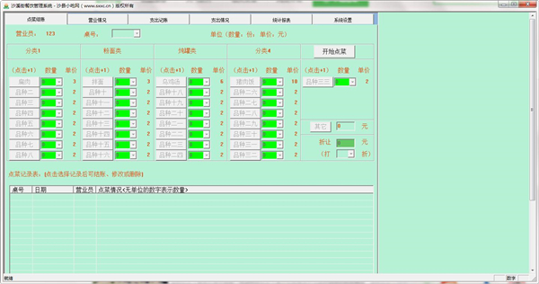 3、功能齐全,具备五大功能模块:点菜结账、营业情况、支出记账、支出情况、统计报表。