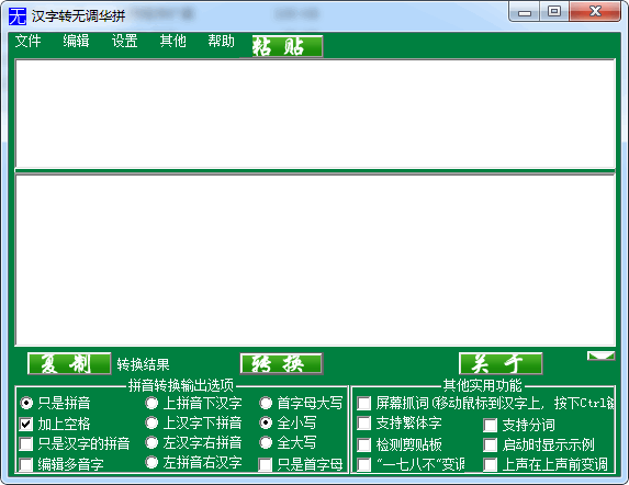 汉字转无调华拼绿色版是款支持识别多音字的拼音转换工具,字转无调华拼绿色版帮助您配置一篇具有拼音的汉字文本,一键复制粘贴文字到软件上转换,就可以自动为你的文字配置上拼音,您可以选择拼音显示在汉字的上方或者是下方,让您在查看的时候更加方便!