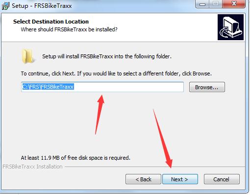 3、选择安装目的地,默认的是“C:\FRS\FRSBikeTraxx”,可以点browse自定义