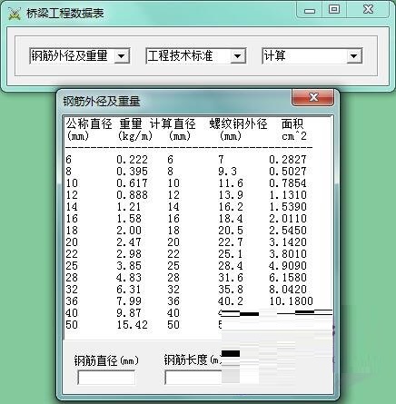 桥梁钢筋计算软件绿色版是一款功能相当不错的桥梁钢筋计算工具,桥梁钢筋计算软件绿色版主要用于计算钢筋的外径及重量、线膨胀系数、直线插值、结构重要性系数、桥涵设计车道数、设计洪水频率、材料的重力密度等等。